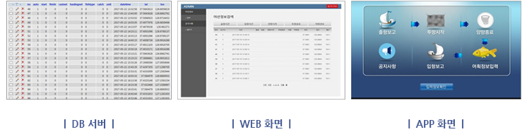 전자조업일지 시스템연근해어선에서 어획된 다양한 어종의 어획정보를 웹으로 실시간으로 모니터링하며, 전자조업일지 APP을 통해 조업실적보고 시스템(입출항보고, 어획량 보고 등)을 간소화시켜 어업인의 부담을 완화시킨다.